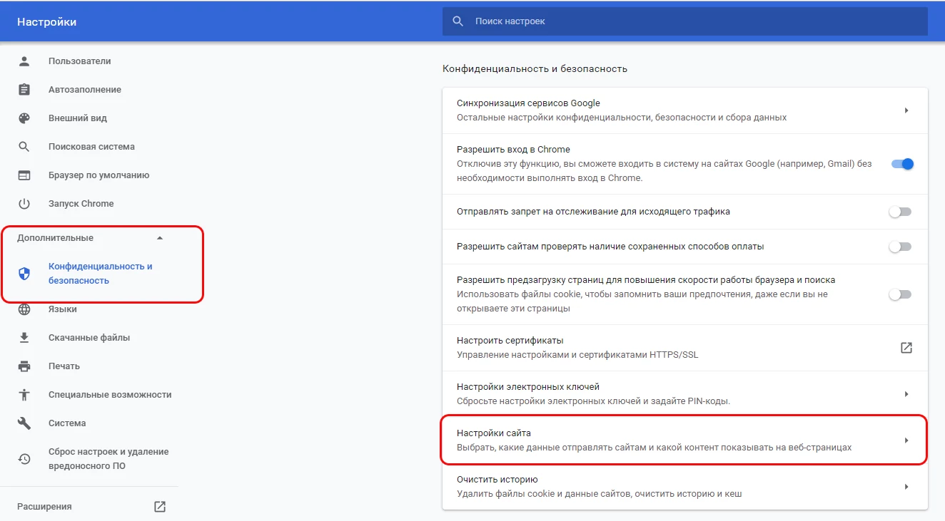 4. В разделе "Конфиденциальность и безопасность" нажмите кнопку "Настройки сайта":