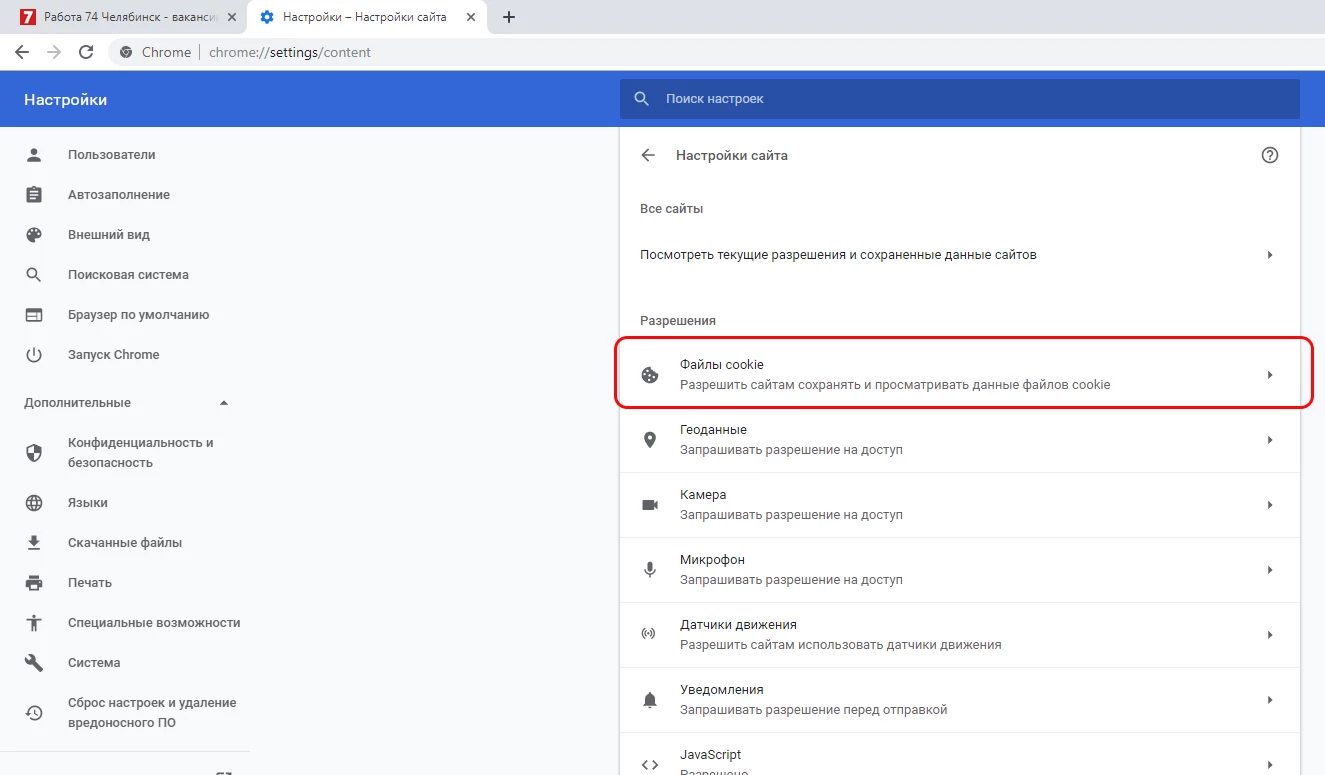 5. Далее "Файлы Cookie";