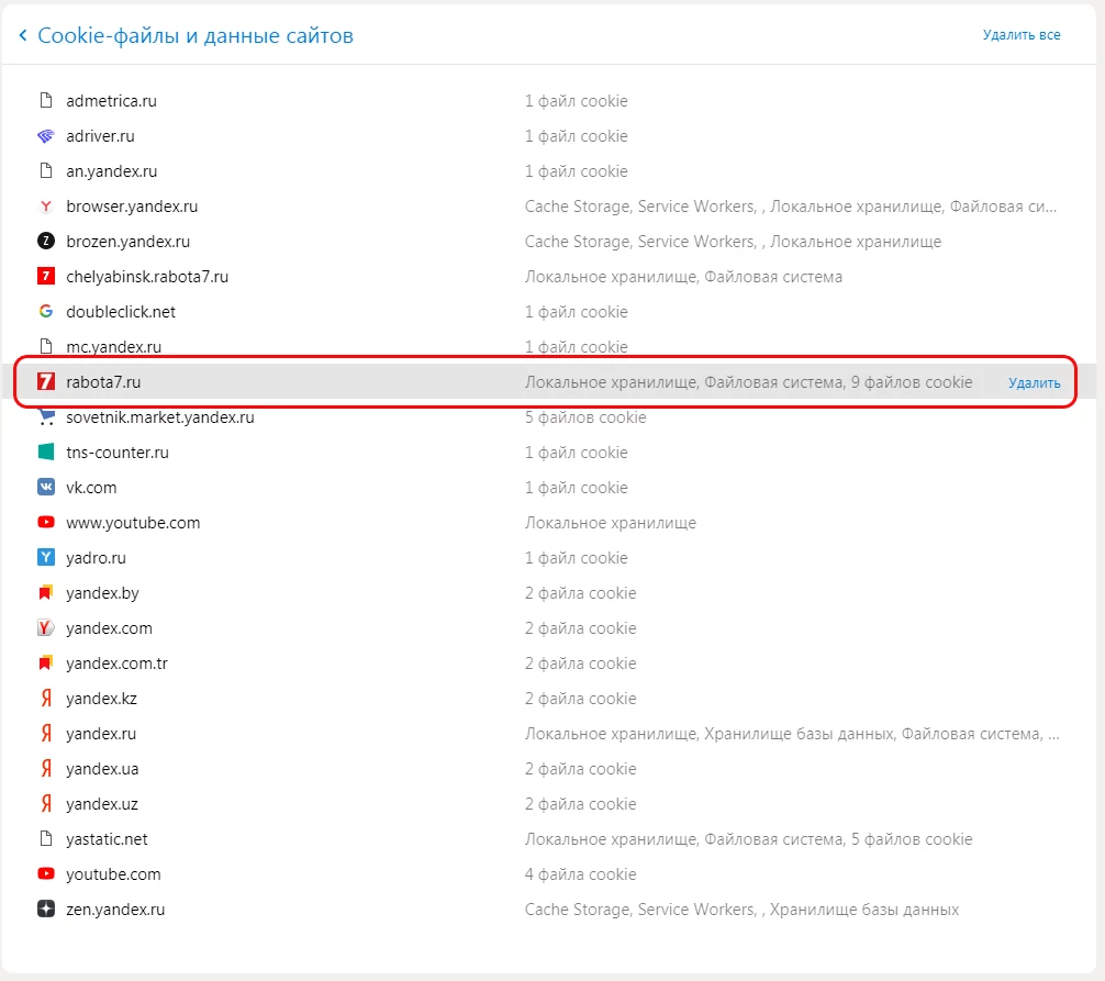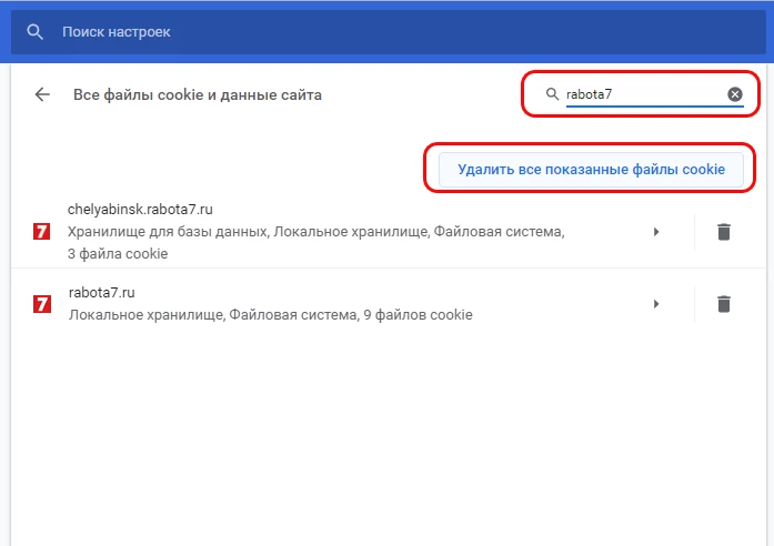 6. В появившемся в пункте "Все файлы cookie и данные сайта" в окне в поисковой строке укажите ключевые слова Rabota7;